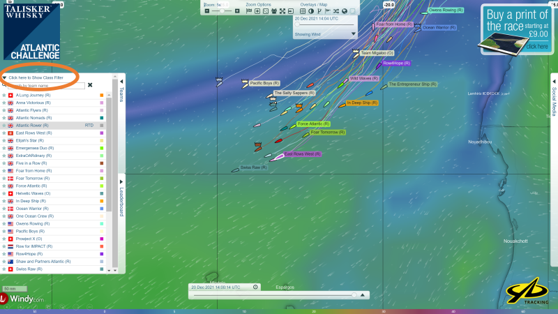 Helemaal links op het scherm kun je kiezen uit 'Teams' en 'Leaderboard'. Klik op Teams en het overzicht van alle teams klapt uit. Bovenin kun je filteren door te klikken op 'click here to show class filter'. Vink de klassen aan of uit en het overzicht per gewenste klassen komt in beeld. Klik op een team voor een highlight van de betreffende boot. De extensie RTD betekend 'Retired', dit team heeft opgegeven.