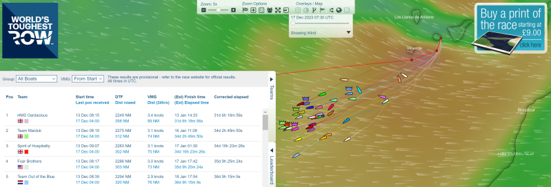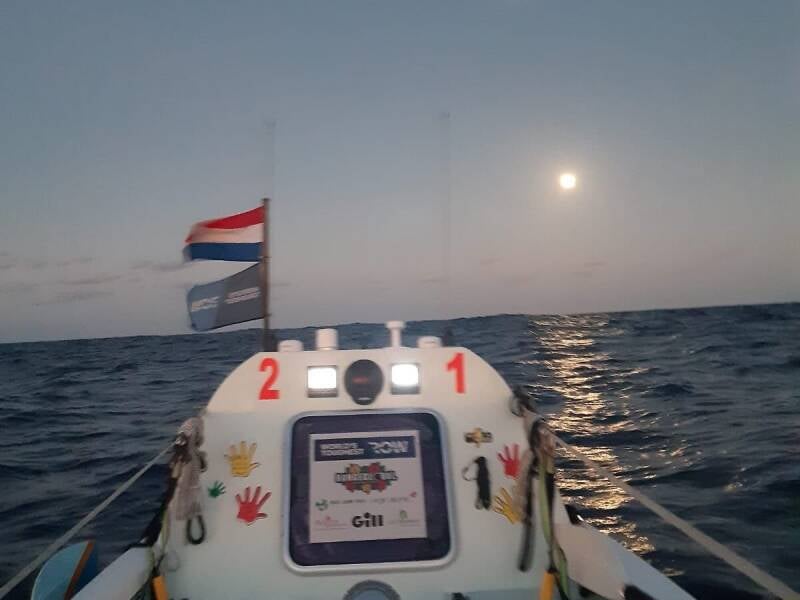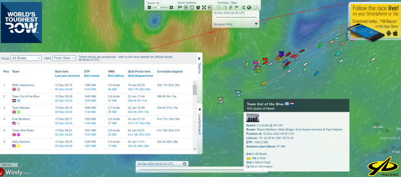 Inmiddels dag 11 van World's Toughest Row. En de eerste 10 dagen waren heel tough! We lezen op het Instagram account van Out of the Blue (met mooie foto's en video's!) over een 'rocky week' en op het Instagram account van Hands Atlantic over de 3 'knockdowns' (de boot rolt dan 90 graden op een zijde en net niet om). De Blue Atlantics stuurden via hun Facebookpagina hun eerste video vanaf de oceaan! Met het bericht "𝘋𝘦 𝘦𝘦𝘳𝘴𝘵𝘦 9 𝘥𝘢𝘨𝘦𝘯 𝘻𝘪𝘫𝘯 𝘦𝘦𝘯 𝘧𝘦𝘪𝘵, 𝘦𝘯 𝘻𝘦 𝘸𝘢𝘳𝘦𝘯 𝘩𝘦𝘧𝘵𝘪𝘨: 𝘩𝘢𝘳𝘥𝘦 𝘸𝘪𝘯𝘥 𝘵𝘰𝘵 30 𝘬𝘵𝘴 (𝘸𝘪𝘯𝘥𝘬𝘳𝘢𝘤𝘩𝘵 7), 𝘩𝘦𝘦𝘭 𝘩𝘦𝘭𝘦 𝘩𝘰𝘨𝘦 𝘨𝘰𝘭𝘷𝘦𝘯, 𝘥𝘦 𝘮𝘰𝘦𝘪𝘭𝘪𝘫𝘬𝘦 𝘬𝘦𝘶𝘻𝘦 𝘦𝘦𝘯 𝘯𝘢𝘤𝘩𝘵 𝘷𝘰𝘰𝘳 𝘱𝘢𝘳𝘢-𝘢𝘯𝘬𝘦𝘳 𝘵𝘦 𝘨𝘢𝘢𝘯, 𝘦𝘦𝘯 𝘨𝘦𝘣𝘳𝘰𝘬𝘦𝘯 𝘳𝘪𝘦𝘮". Ook zij hadden een knockdown en besloten toen om een nacht achter het para-anker af te wachten. Momenteel is de vloot in rustiger vaarwater, en de komende dagen blijft dat zo. Na de Kerst kan een lagedrukgebied ten noorden van de vloot wellicht tegenwind en opnieuw hoge golven veroorzaken..... Team Out of the Blue jaagt op de 3e positie! Nummer 2 Team Marduk ligt ruim 100 NM ten noorden van ze, maar in de kortste afstand tot de finish is het verschil slechts 3 NM!