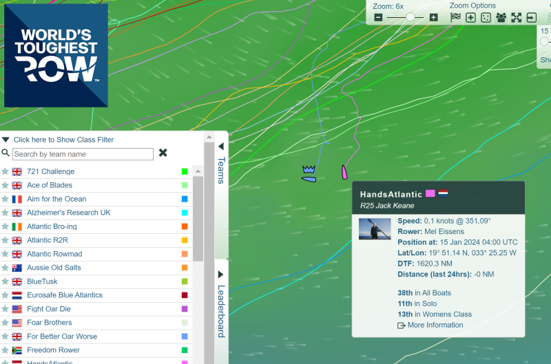 Eergisteren lazen we op de Facebookpagina van Hands Atlantic dat er contact was met Mel Eissens, ze maakt goede vorderingen en roeit hard. Het was een lastige start, met hoge deining en harde wind die de 1e dagen een groter uitdaging maakten en wat zeeziekte veroorzaakten. We hebben van de overige NL-deelnemers nog geen updates gezien. Ook van andere teams zagen we dat de 1e dagen pittig waren. Flinke golven van 3 meter hoog uit verschillende richtingen zorgden voor veel zeeziekte en enkele teams zijn in de 1e dagen al bijna gekapseisd en hebben al het drijfanker gebruikt. Na 5 dagen zijn de deelnemers als het goed is gewend geraakt aan het ritme en doseren van roeien en rust. De krachtige wind (6 tot 7 Beaufort) uit het oosten stuwt de vloot in de juiste richting maar veroorzaakt ook hoge golven. De afstand tussen de nummers 1 en 38 bedraagt inmiddels 500 km!